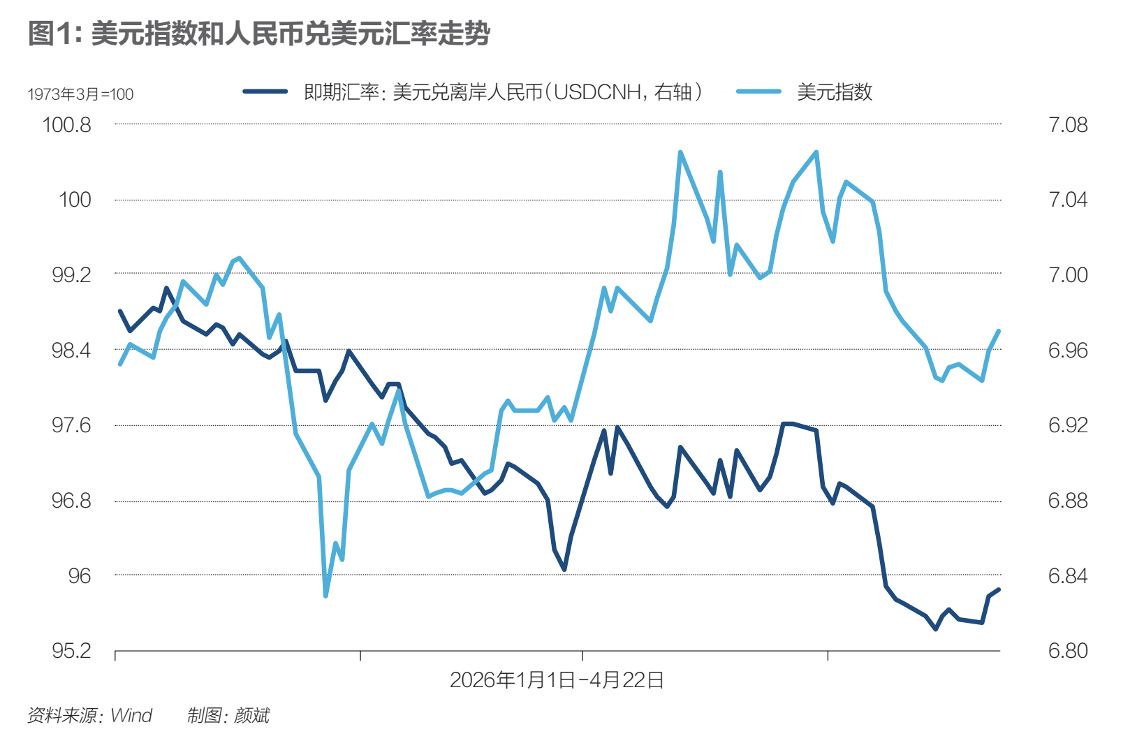 随着投资者避险情绪高涨,美元指数冲高回落,几度上破100点,触及近一年高点。美元强,人民币更强。Wind(万得)数据显示,截至4月21日,人民币兑美元汇率较战事前升值超1%。